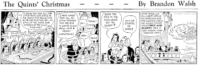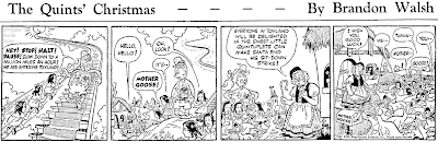 Beginning today we're running the 1940 King Features Christmas story strip The Quints' Christmas. The title children are the famous Dionne Quintuplets, the first quints to survive infancy. The Dionnes were world famous at the time, and sadly were exploited unmercifully by their caretakers to make a fortune off their fame. You can read their sad story here on Wiki.