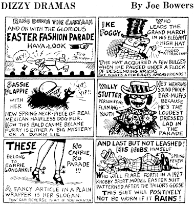 Dizzy Dramas was distributed by the Ledger Syndicate of Philadelphia, and they initially ran it in their tabloid paper, the Philadelphia Sun. The feature started there on February 7 1927, though a contemporary article in Editor & Publisher cites a start date sometime in January. Eventually the long-running strip was moved over to the Philadelphia Evening Bulletin, where it ended on May 2 1942. Although this was probably the end of new material, the strip was sold in reprints for many years. I've seen it appearing as late as 1957.