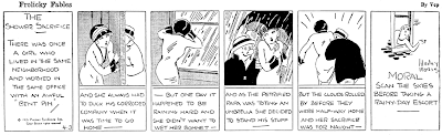 If you need to bone up on hip 1920's slang, look no further than Frolicky Fables for the graduate-level course.This swingin' strip, filled with tongue in cheek advice for the Lost Generation, began in the New York Mirror on November 23 1925, and was distributed elsewhere by Premier Syndicate, the imprint reserved mostly for Hearst's scrapings from the bottom of the barrel.