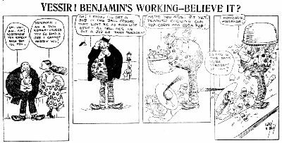 The strip debuted on June 12 1911, and at the beginning the strip should more properly be called Benjamin, as our hero's moniker had yet to be shortened. The feature was uncredited at first, but was probably by the same fellow who began signing the strip as Harry B. Dally on September 1 of that year. I don't know if Mr. Dally was a real person; it may have been a pen name. Dally disappeared for a short while in November, when the strip was taken over by a fellow who signed himself Herrmann. This cartoonist took over for Dally for about a month, and then Dally was back at the helm.