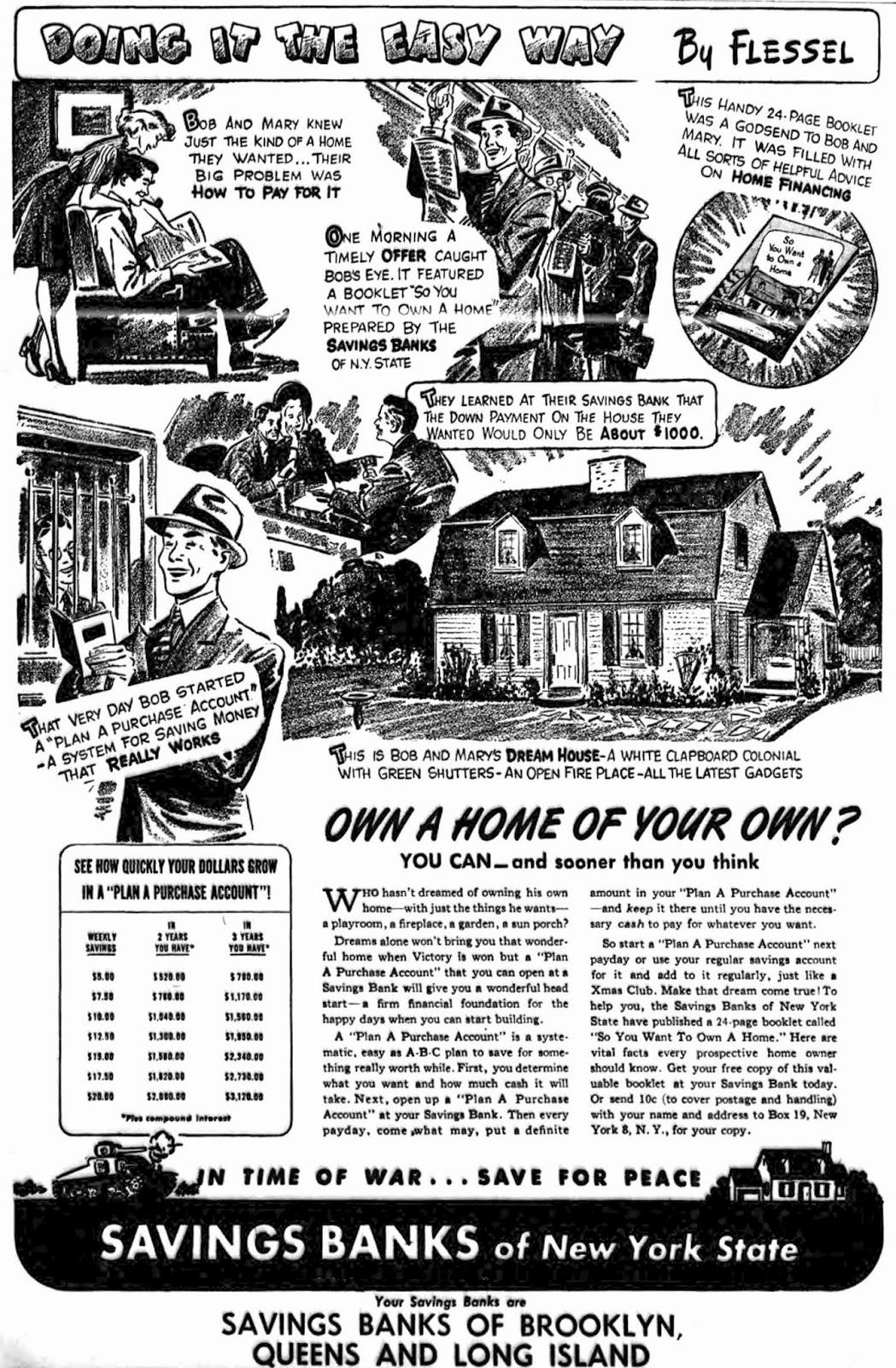 Another advertising campaign, illustrated by Flessel, was for New York state savings banks; the advertisements ran in 1944 and 1945.