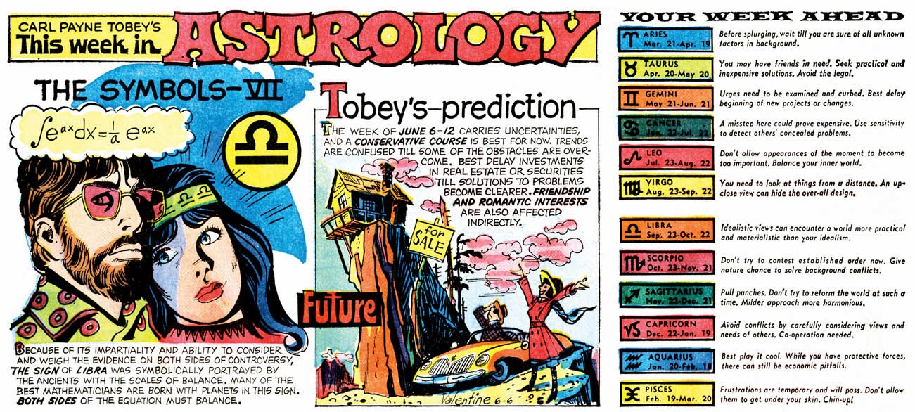 This Week In Astrology, an NEA-distributed horoscope feature by Carl Payne Tobey that debuted in 1969 and ended around 1977, doesn't qualify for listing in American Newspaper Comics. In its early days the graphics were large if not central to the purpose of the feature, but the text slowly but surely chipped away until the cartoons weren't much more than incidental.