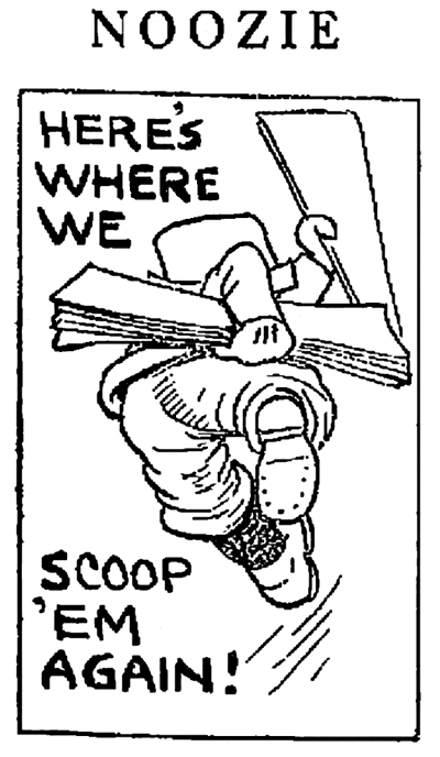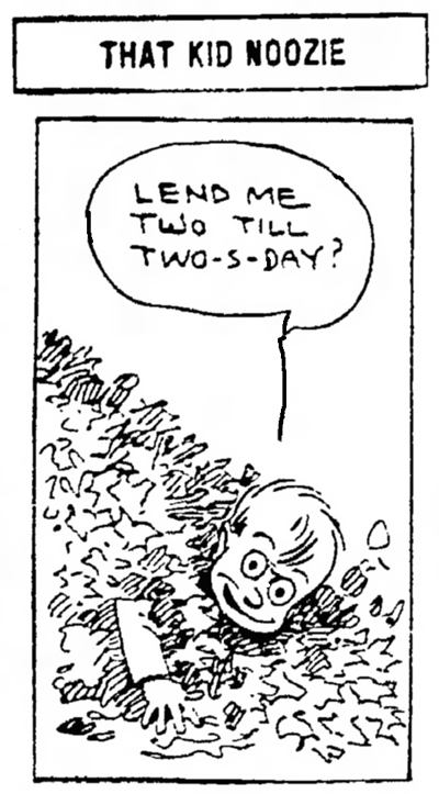 Noozie is one of those cartoons that is sometimes used as a "weather ear". What in the Sam Hill does that mean, you ask? Well, on the front page of your newspaper you have the masthead at the top middle, and the 'stuff' on the left and right are known as 'ears'. Usually one of the ears has the day's weather forecast, hence weather ear. Some papers liked to dress up their weather ears with a cartoon. This can be as simple and repetitive as a character who is covered in snow, drenched by rain, and so on depending on the forecast, or it can be new every day, and not necessarily even comment on the weather. The St. Louis Post-Dispatch Weather Bird, for instance, began as a weather cartoon, then branched out into humor and editorializing.