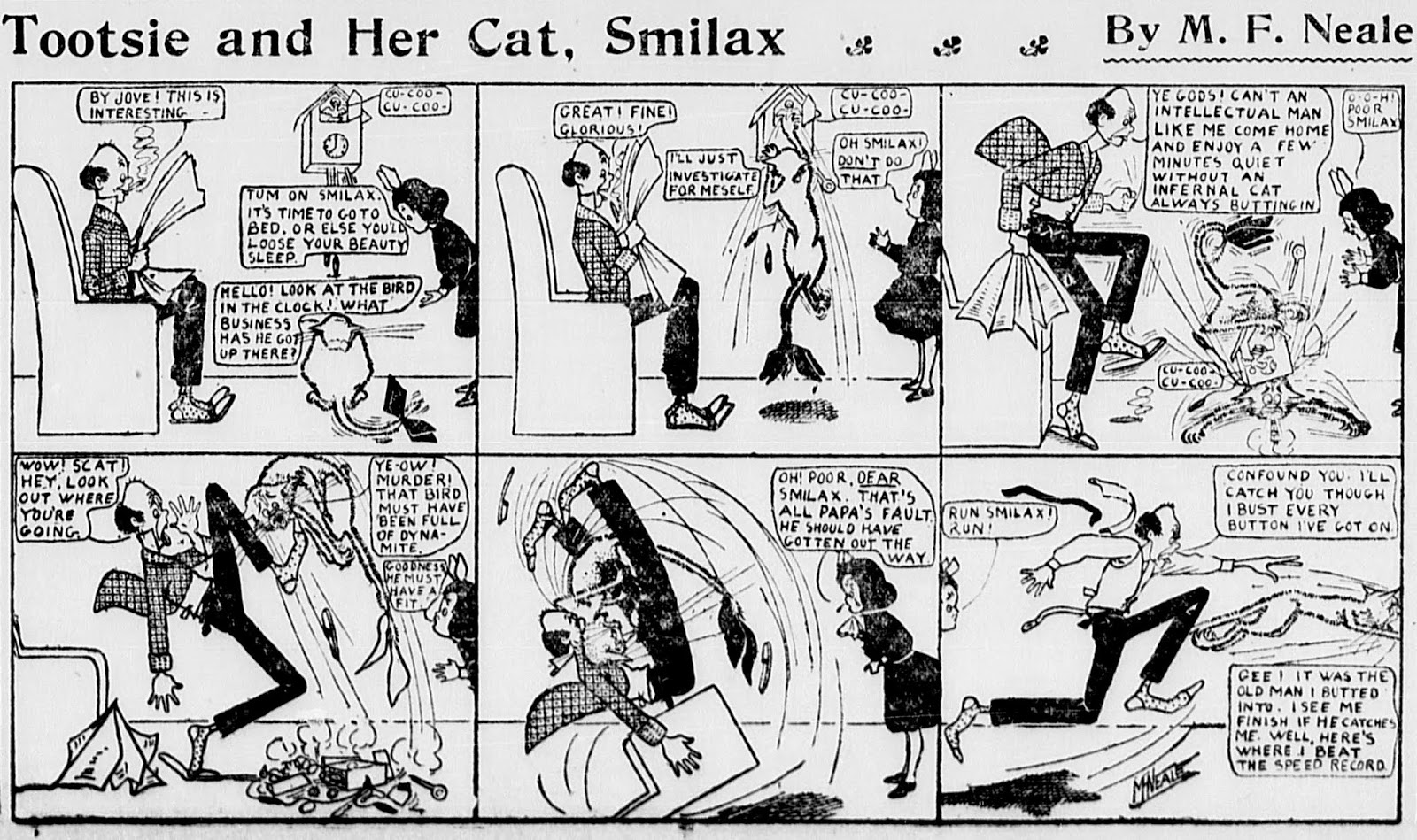 American Newspaper Comics (2012) said Tootsie and Her Cat, Smilax was Neale’s first comic strip, which ran in the New York World from December 27, 1907 to January 23, 1908. Smilax was followed by Dolly Doo Does Her Dad. The Bulletin said he produced cartoons for Puck and Judge magazines.