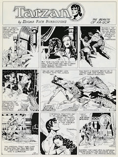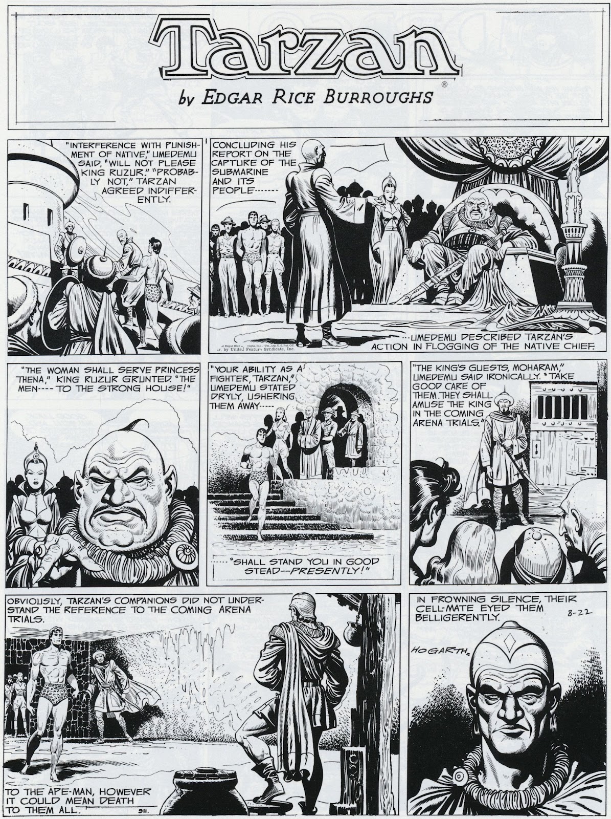 In the winter of 1937 he visited United Features and learned that Hal Foster was leaving the Tarzan strip. Hogarth accepted the invitation to submit samples. Later he learned he got the assignment because the United Features general manger could not tell the difference between his and Foster’s work. His first Sunday page appeared May 9, 1937 and the last on November 25, 1945. A dispute with the syndicate led to Hogarth’s departure. After Tarzan, he produced the strip, Drago, for the Robert Hall Syndicate.