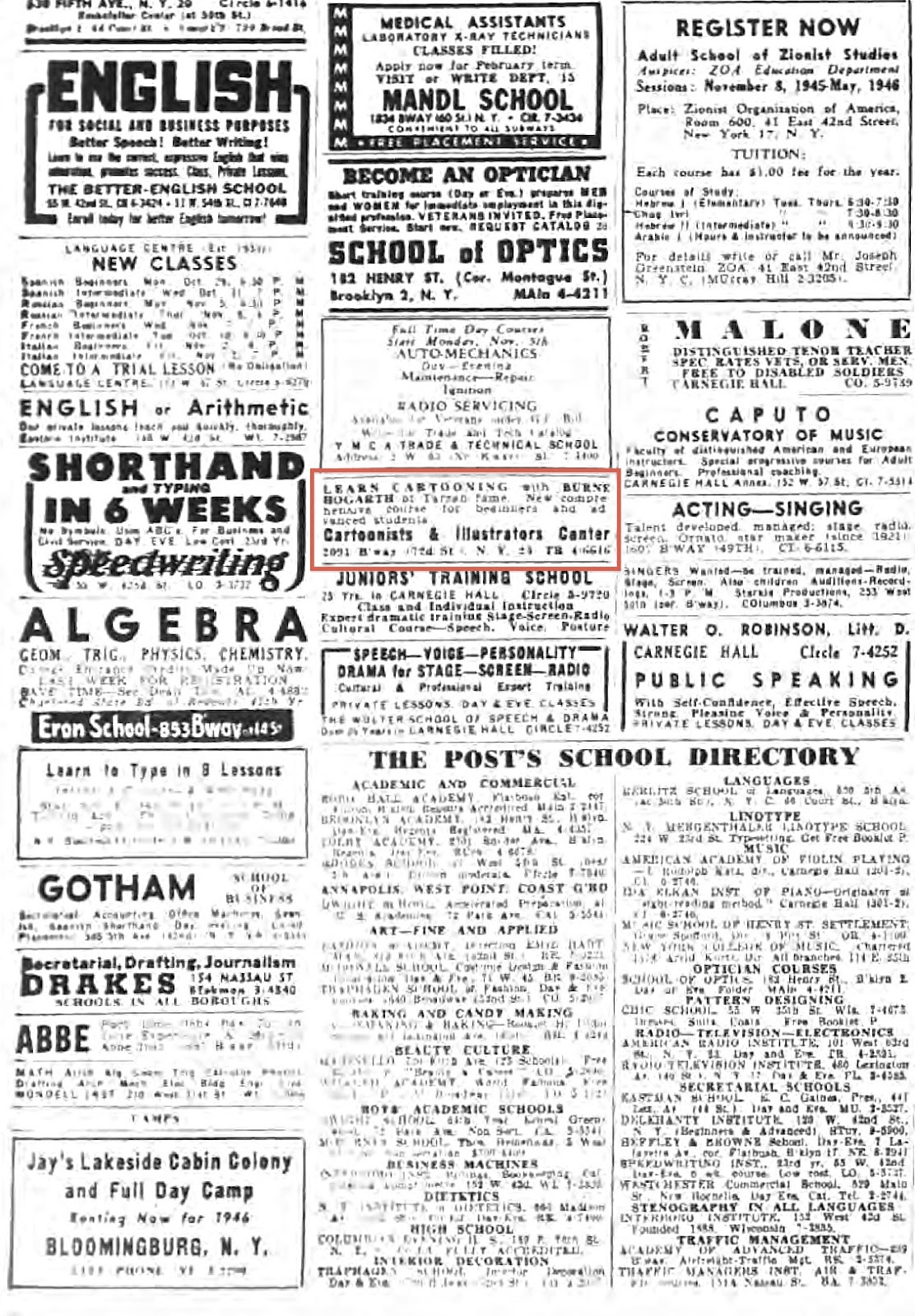 In 1940, Hogarth was married to Rhoda and, since 1935, lived at 26 West 74th Street in New York City. The Manhattan Telephone Directory 1942 had his home address at 66 West 88th Street. His business address was 2091 Broadway in the 1945 directory. In the Comics Journal #167, April 1994, when asked how the School of Visual Arts started, he said around 1945 war veterans began contacting him for cartooning advice. He would invite them to his apartment, on Saturdays, to give advice and do demonstrations. To accommodate the growing number of veterans, he looked around his neighborhood and found space at a private secondary school, which was a high school. There he met Silas Rhodes, an English teacher, who suggested that he open a school. Hogarth asked what was involved and Rhodes explained the procedures. Hogarth recalled that he rented a loft on 72nd Street and Broadway and called it the Academy of Newspaper Art. A search of that name produced nothing, however, a series of small advertisements for the Cartoonists & Illustrators Center appeared in October 1945 issues of the New York Post.