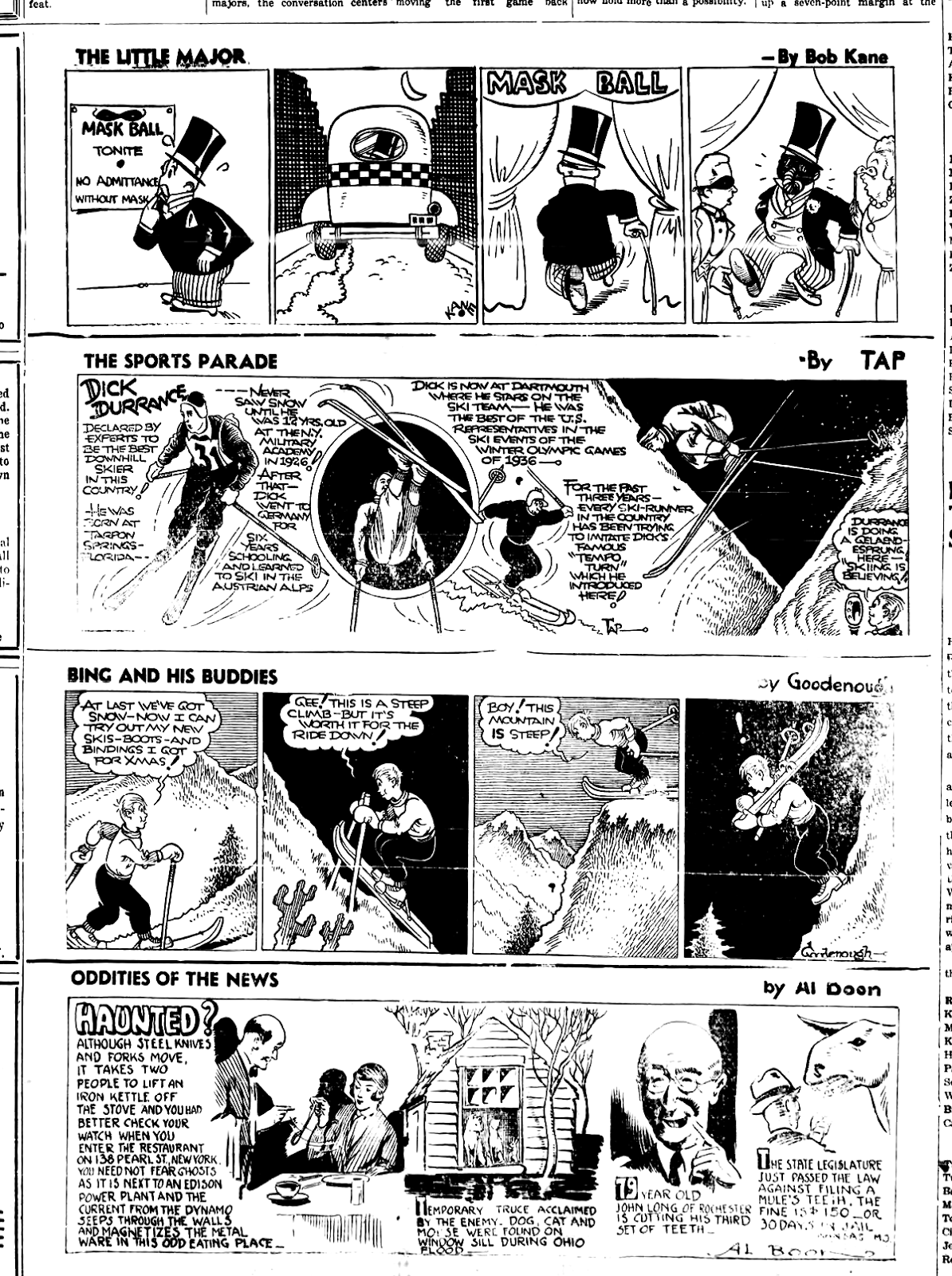 Recently, fellow comic strip researcher Art Lortie made one of his intrepid forays onto that annoying Fulton Postcards website. He downloaded a selection of material from the weekly newspaper Hastings News of Hastings-on-the-Hudson, New York, which he shared here. Art almost offhandedly mentioned that there was some oddball material in 1937 that included a strip by Bob (Batman) Kane. That certainly got me curious. Well, as it turned out, Art had uncovered what is most likely a complete run of all the General Features Syndicate strips.