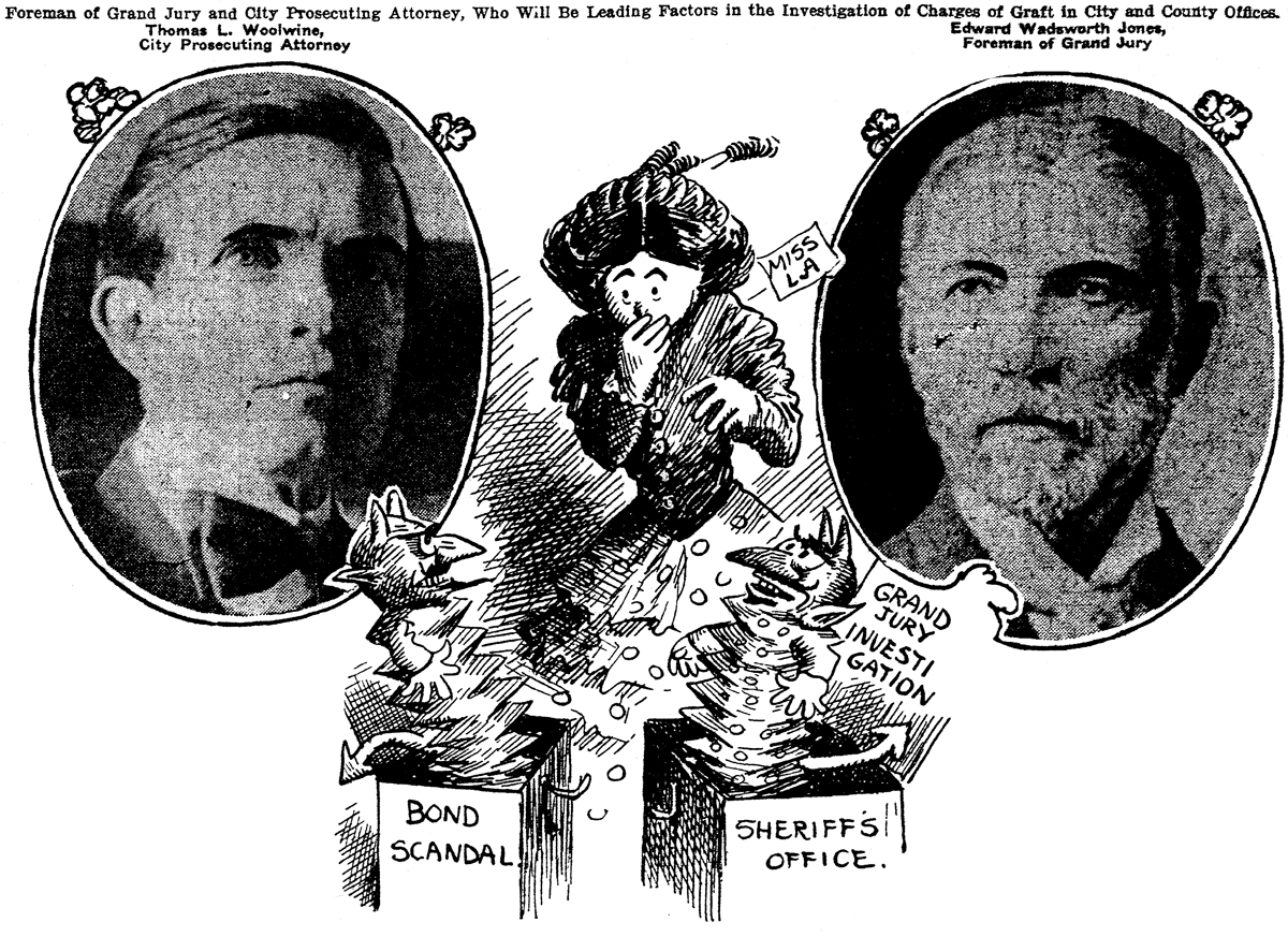 Saturday, September 19 1908 -- The LA Examiner, and cartoonist Herriman, have been concentrating on this bond scandal lately, but the city and county are under investigation for hanky-panky on a number of fronts. Everything is coming to a head now, as a combined case has been brought before the grand jury.