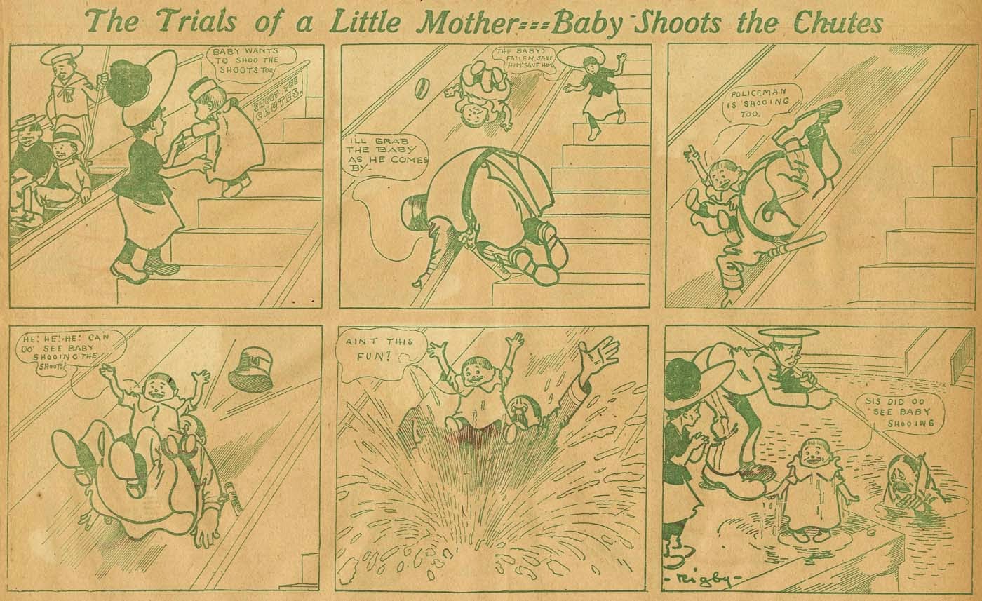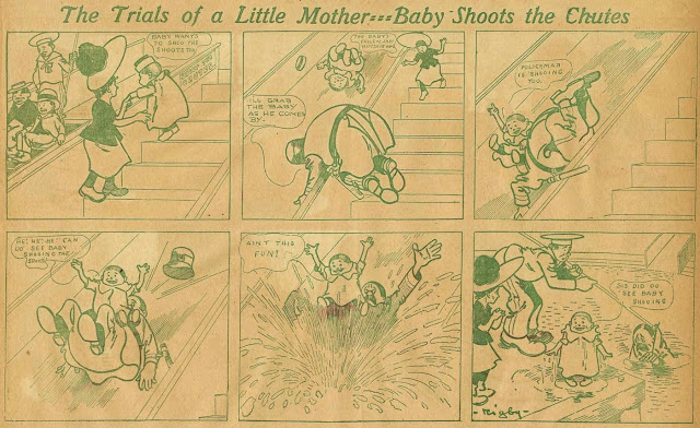 Here's an entry titled The Trials of a Little Mother from journeyman ink-slinger Clarence Rigby, which appeared in one of the McClure pre-print comics sections from March 29 to September 6 1903, and was then reprinted occasionally in their sections from 1906 to 1908. Sometimes the strip goes with the obvious sort of gag where the baby causes a catastrophe, but other times Rigby takes the more interesting tack and has the baby save the day, like in the middle example above.