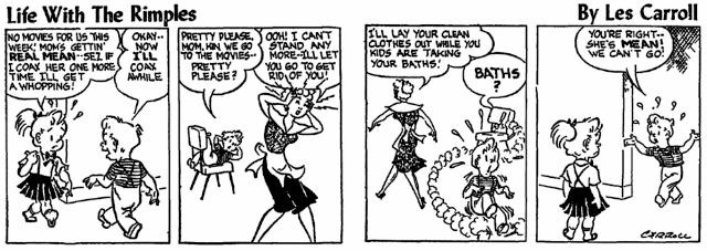 Carroll did a very nice job with the art, and the gags, though utterly conventional, were played out well. However, when he was assigned by NEA to take over Boots and her Buddies, and later Our Boarding House, you could definitely tell that the Rimples strips were getting less and less attention. By April 4 1975, the last time the strip appears in the NEA archives†, the art was only a shadow of its former slick self. Of course, Carroll was also not a young man by 1975, and perhaps it was simply the onset of old age.