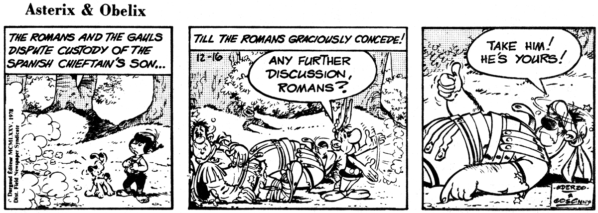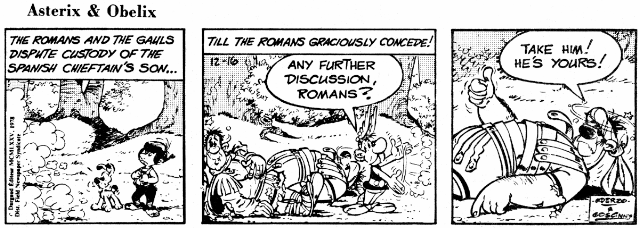 Not many newspaper clients signed up for the strip originally, so by the end of the run, the clientele was tiny. In fact, I've been searching for a definitive end date of the strip for years. Just recently, Jeffrey Lindenblatt discovered a newspaper, the New Castle News, that ran it the longest so far found -- the daily ending on March 10 1979. I've seen the last strip from that run, and it ends seven pages into the Asterix in Britain album. That makes me wonder if Asterix in Spain ended earlier than reported on the Wikipedia page, or if the editors lopped off an awful lot of the Britain storyline, perhaps even dropping the first five or so pages, which don't feature Asterix.