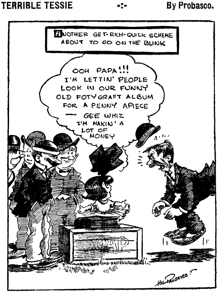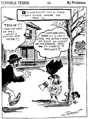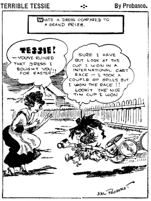 Just one week in, Probasco was already realizing that two things could happen, neither of them good. Either readers would get sick of this weak concept in pretty short order, or they'd like it so much that Probasco would be condemned to thinking up six of these dumb gags every week, perhaps (gasp!) forever. So, starting the second week, Probasco decided that he could handle three That's Different gags each week without courting madness, and added a second feature titled Terrible Tessie to run the other three days. Terrible Tessie was a better idea, but still not terribly original. The titular little girl is a little hellion who constantly gets in trouble, but Probasco paints her as unintentionally so -- more Dennis the Menace than Katzenjammer Kid. Terrible Tessie was by far the better feature, but for some reason Probasco stuck with both throughout the three year run.