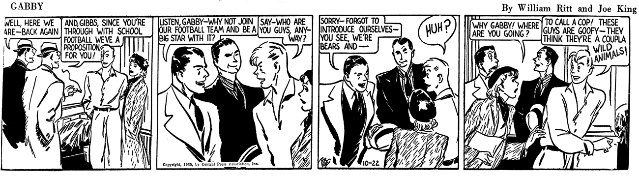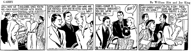 Oddly, though, the strip had few takers. Maybe the Frank Merriwell name really was worth something after all. But the folks at CPA obviously didn't think that was the problem. Thus, on July 27 1935 Chip Collins was sent packing, and on Monday the 29th yet another gifted young athlete took his place. The new strip was titled Gabby, and here the kid was a hayseed who had a rocket pitching arm. His gift got him into a fancy college, where (big surprise) he excelled at all sports, was a great pal to all the fellows, and the target of every schoolgirl's (chaste) desire.