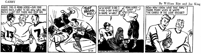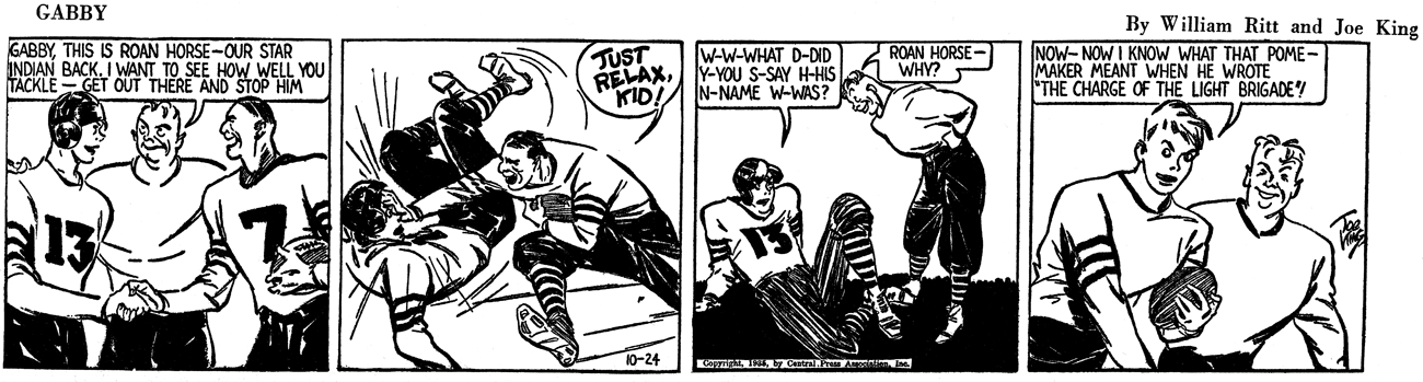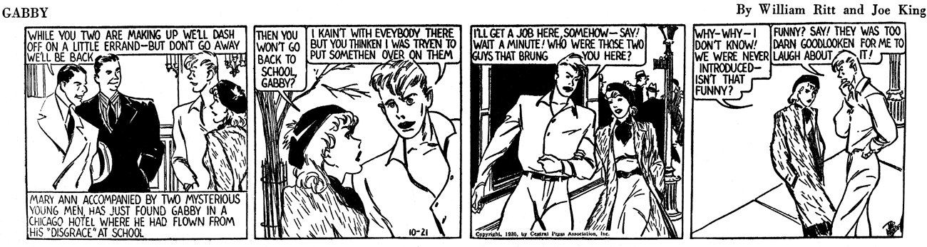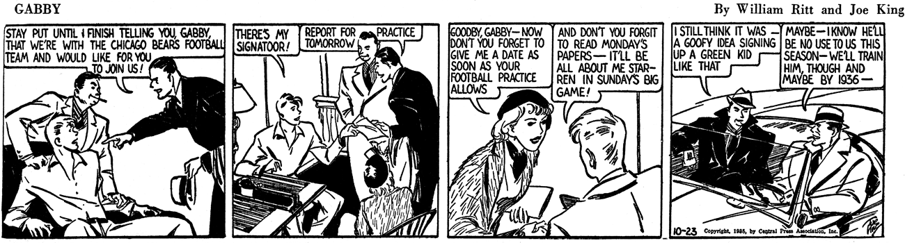 In American Newspaper Comics (2012), Albert Becattini said Ritt wrote Frank Merriwell’s Schooldays which ran from mid-1931 to mid-1934. Ritt created Brick Bradford which was drawn by Clarence Gray. The strip debuted August 21, 1933 and ended March 24, 1957. Ritt’s last daily strip was November 13, 1948 and Sunday on June 12, 1949. The Brick Bradford topper was The Time Top which ran for two months in 1935. With the success of Brick Bradford, Ritt created Chip Collins’ Adventures which began July 16, 1934 and lasted a year. Artist Jack Wilhelm started the strip and was followed by Paul Frehm. Additional scripts were by Jack Kofoed and Sheldon Stark. When Chip Collins’ Adventures ended it was replaced by Ritt’s Gabby. Joe King drew the strip which lasted from July 29 to October 26, 1935.