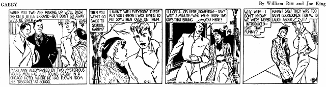 This time the art was provided by Joe King, a fellow who drew so well it really is a shame that he had a silly name. I love his sketchy fat line and his painterly spotting of blacks. Unfortunately, the William Ritt scripts were more of the same that had already killed Chip Collins. Gabby lasted a mere three months, hardly time enough to unpack his bags at the school dorm. Apparently Ritt was caught unawares when the syndicate pulled the plug on Gabby, as the final week of the strip (shown above) is a delightfully screwy attempt to end the strip in some sort of logical manner, which succeeds only in being utterly bizarre.