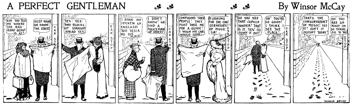 A Perfect Gentleman ran in amongst McCay's other weekday strip titles from November 25 to December 12 1912 in Hearst's New York American.
