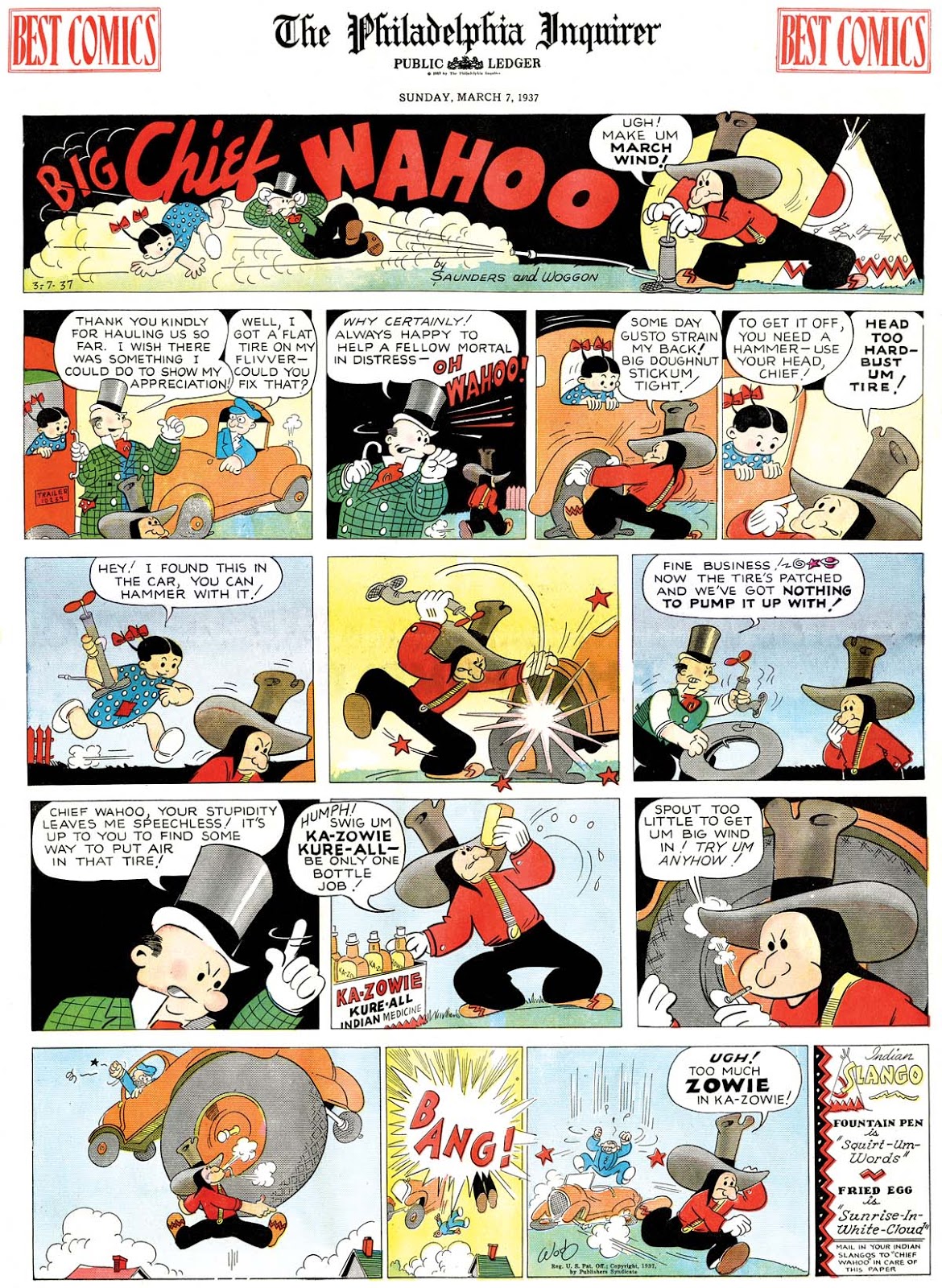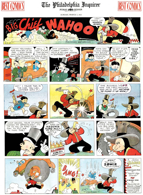 The topper panel Indian Slango, which was usually just a little text box as seen above, is barely a footnote to the complicated history of this comic strip. The panel featured Chief Wahoo's colorful terms for everyday things. As a commentary on Indian names, it was disrespectful I suppose, but Saunders actually came up with some pretty darn colorful and whimsical little zingers, as seen in the sample above. Unfortunately, Indian Slango was mostly made up from reader submissions, and you sure could tell why Allen Saunders got paid, while his readers didn't.
