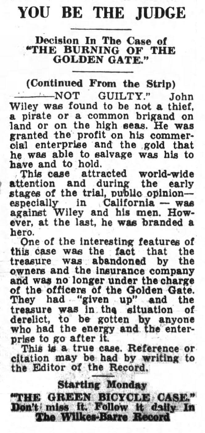 Enthused with this wealth of information, Crutcher convinced Heine to become the writer of a new daily comic strip, You Be The Judge. Robert Wathen, a local watercolor artist, was to be the illustrator. His son, Joe Wathen, said in a comment on this blog that his dad “found characters to draw into the strip by visiting bars in downtown Louisville” (August 5, 2009). Neither Wathen nor Heine had any experience in the comic strip field nor would they have any additional ones in the future. That, however, didn’t deter Crutcher from marketing it. To that extent, still employed by the Courier-Journal, he ambitiously launched the Carlile Crutcher Newspaper Feature Syndicate, nominally a news service but mostly dedicated to the distribution of the new comic strip, which made its first appearance on July 6, 1936. Its first installment was titled “The Burning of the Golden Gate,” not referring to the famous San Francisco Bay bridge, but to the sinking of a steamship of that name bound for Panama. The Wilkes-Barre (PA) Record was one of the few newspapers that carried it that day. Freak Patents continued for another month but on August 8 was published for the last time.