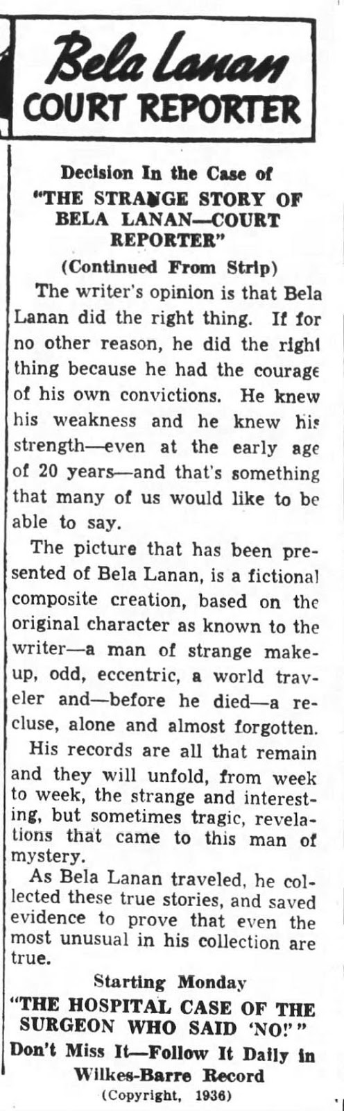 | Bela Lanan's biography in You Be The Judge, 9/21 - 9/26/1936 |