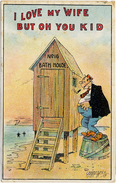 Here's a card from his popular series I Love My Wife But Oh You Kid. A song of this title (listen here) made this catchphrase a huge pop phenomenon in 1909 and later. Carmichael illustrates the phrase over and over, in each a married geezer ogles a beauteous young maid. These are all racy cards, but unfortunately in this one we don't get to see the lovely girl as we do on most. What we lose in sexiness we sure do make up in Peeping Tom creepiness!