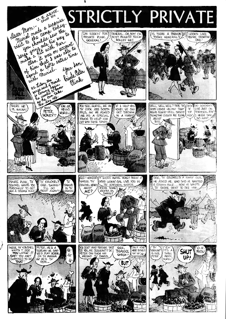 Page Seven -- Strictly Private by Quin Hall. This is the army comic that scooped the field just a year ago and has been scooping all the competition since. Private Peter Plink is popular from Honolulu to Hackensack but he's most popular with the soldiers themselves.