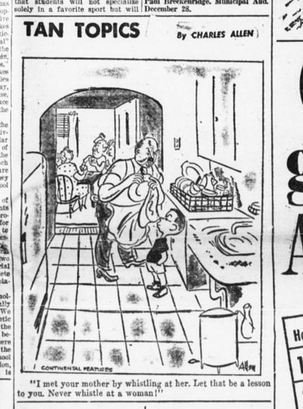 Tan Topics was drawn in brush and ink by Charles Allen (?–?) as a single-panel gag comic. Continental Features distributed Tan Topics nationally during the early 1940s.