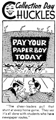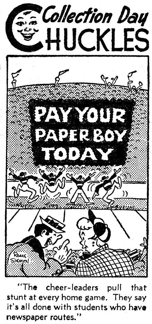 In 1948 the organization put together a series of panel cartoons titled Collection Day Chuckles, and offered them free to newspapers. The idea, obviously, was to remind newspaper readers to pay their newsboys. Although the gags were pretty uniformly bland and unfunny, the point was being made.