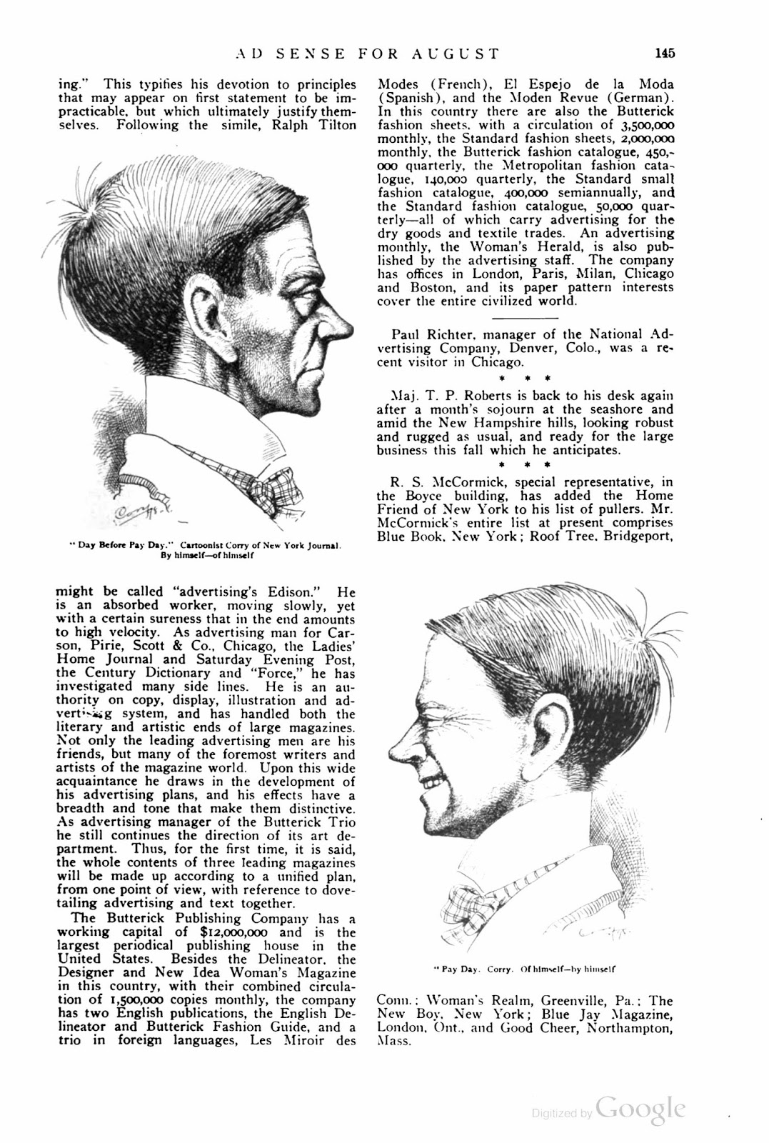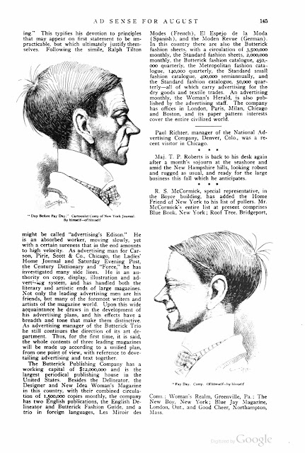 Cory’s book, The Cartoonist’s Art, was published in 1912. Cory’s drawings appeared in the Chicago-based publication, The Day Book in 1912 and 1913. In 1913 Cory’s portraits of President Wilson’s cabinet members appeared in the Sante Fe New Mexican. The Publishers Feature Bureau ran this advertisement in Cartoons Magazine, March 1917.