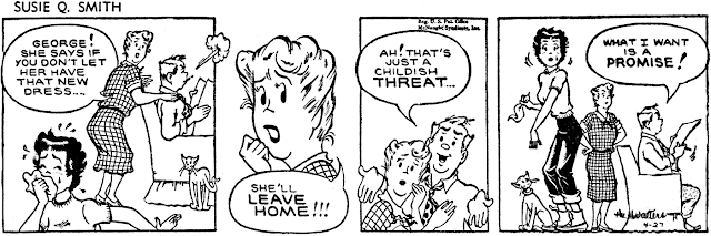 Susie Q. Smith, whose title was often abbreviated by lazy typesetters as just Susie Q, debuted with King Features on the first day of 1945, and garnered enough clients to be considered at least a modest success. The panel about a teenage girl hit all the familiar hot buttons -- dating, school, dealing with parents and siblings. What set it apart, at least slightly, was that it was unusually frank about Susie's romantic life. Susie and her pals are often depicted in the midst of communal make-out sessions, something you'd rarely if ever see in the typically modest teenage features like Harold Teen, Aggie Mack and the like. For some reason the newspaper comics page could not rise to the level of frankness of popular movies and radio shows, and teens in the newspaper were, other than Susie, almost embarrassingly unsexual.