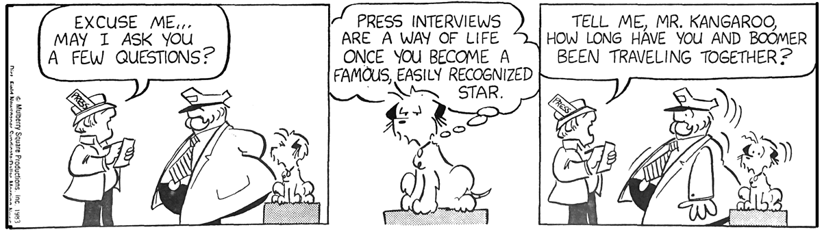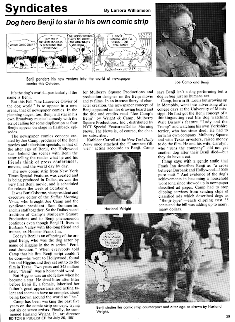More successful movies and TV appearances ensued, and in 1981 Camp was approached about the possibility of a Benji newspaper comic strip. The realization of the strip took three companies -- Camp's own Mulberry Square Productions, the Dallas Morning News (the publisher lived next door to Camp), and New York Times Special Features. The Times had recently dipped a toe into the comic strip syndication world with very modest success, and Benji was destined to be the final feature introduced by them.