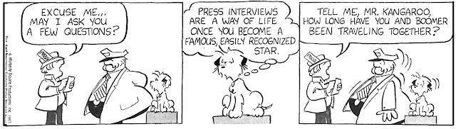 One of my most treasured possessions is a letter from Berke Breathed excoriating me for not signing the Benji work. This was during the time period after Breathed had graduated from the Univ. of Texas, but right before the launch of Bloom County. Breathed had been drawing Academia Waltz at UT while I was a high school student in San Antonio and the paperback collections of his college work had inspired me to start a daily strip at North Texas State when I went there (which is what eventually led to the Benji gig). I had sent Breathed some samples of my college work and corresponded a couple of times and then sent him a few of the Benji clips. His response to my working part-time illustrating someone else's strip with no credit was written in that exquisite exuberant exasperated style that we all came to know from Breathed.