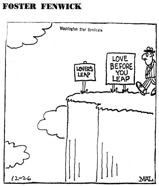 After a lackluster run, the Washington Star Syndicate seems to have dumped it on August 2 1975**. But either Hancock wasn't ready to throw in the towel, or someone at the San Francisco Chronicle really liked it, because the feature returned, now syndicated by Chronicle Features under the shorter title Fenwick, probably around March 1977***. But the Chronicle sales force did any even poorer job of selling it, and they finally gave up in 1982****.