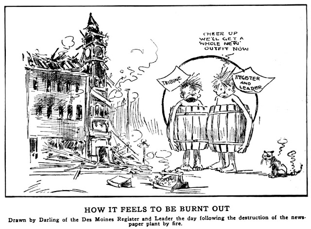 Jay N. Darling, cartoonist of the Des Moines Register and Leader, recently broke all speed records for Iowa's capital city. “Ding” was in search of a cat doctor to make various and sundry repairs upon Thomas, his feline friend and counselor. Thomas was rather seriously scorched when the Register and Leader building burned to the ground recently, and Mr. Darling found his pet wandering about the smoking ruins, rather the worse for wear.