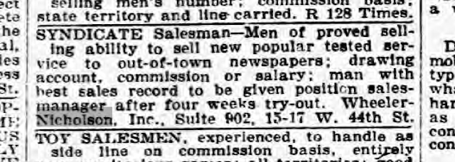 We can tell by the ad that Wheeler-Nicholson seemed to have no existing sales force, as the salesman was promised to become the sales manager in one month. That manager would likely not have had anyone to manage, though, as the company placed no further ads offering positions.