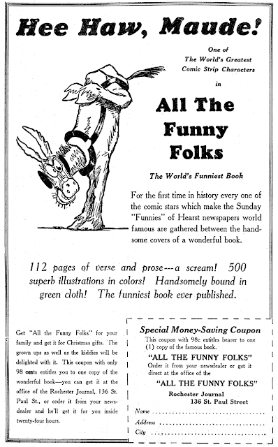 Here's a pair of ads for the 1926 children's book "All The Funny Folk", which starred the whole galaxy of Hearst comic strip stars. The Rochester Journal-American is willing to discount the large hardcover book to a mere 98 pieces of copper. I don't know what the regular price was, but I have seen that Cliff Sterrett autographed copies in a Brooklyn department store that Christmas, and charged a buck apiece. Two cents for the autograph of a famous cartoonist seems quite the bargain, even in 1926!