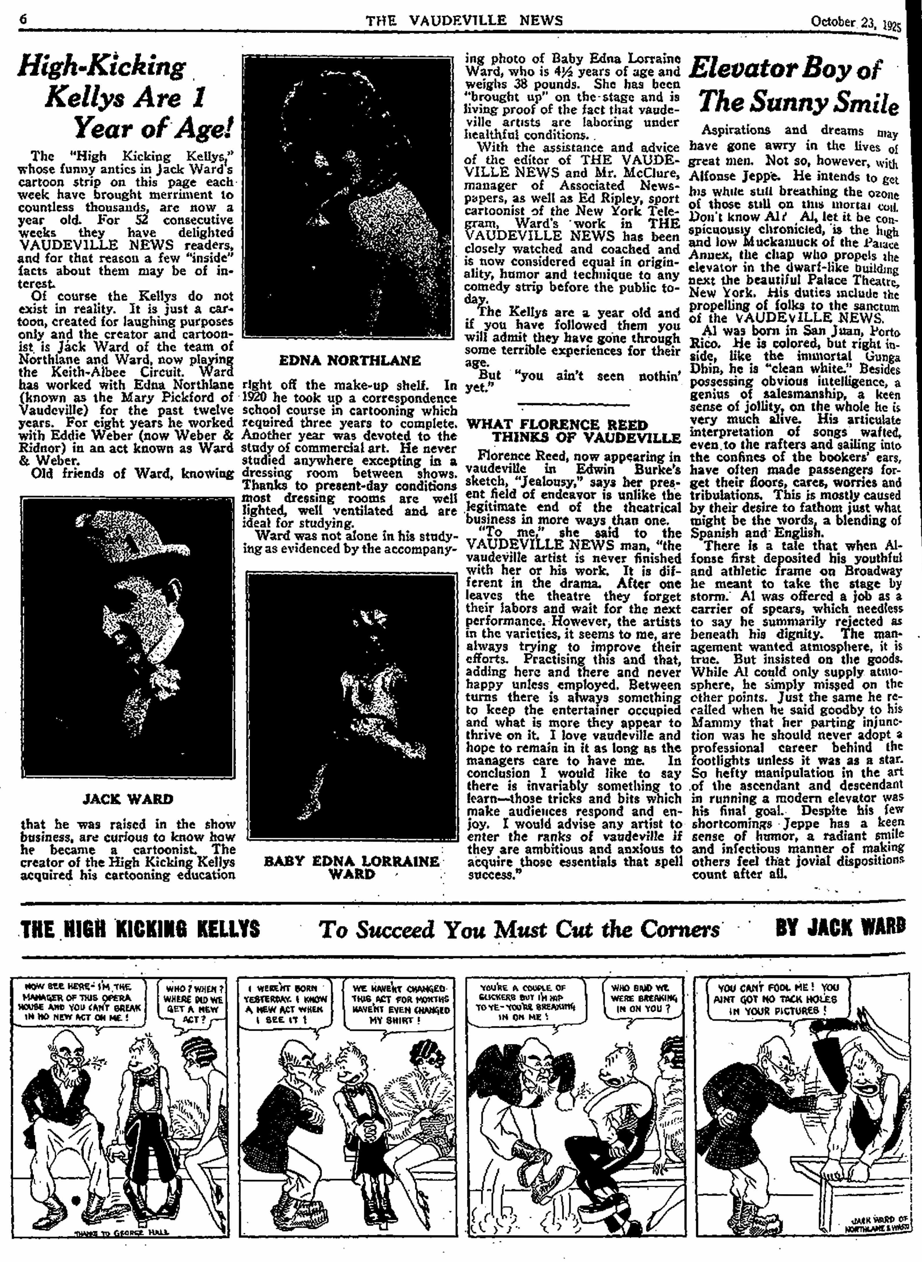 The “High Kicking Kellys,” whose funny antics in Jack Ward’s cartoon strip on this page each week have brought merriment to countless thousands, are now a year old. For 52 consecutive weeks they have delighted Vaudeville News readers, and for that reason a few “inside” facts about them may be of interest.Of course the Kellys do not exist in reality. It is just a cartoon, created for laughing purposes only and the creator and cartoonist is Jack Ward of the team of Northlane and Ward, now playing the Keith-Albee Circuit. Ward has worked with Edna Northlane (known as the Mary Pickford of Vaudeville) for the past twelve years. For eight years he worked with Eddie Weber (now Weber & Ridnor) in an act known as Ward & Weber.Old friends of Ward, knowing that he was raised in the show business, are curious to know how he became a cartoonist. The creator of the High Kicking Kellys acquired his cartooning education right off the make-up shelf. In 1920 he took up a correspondence school course in cartooning which required three years to complete. Another year was devoted to the study of commercial art. He never studied anywhere excepting in a dressing room between shows. Thanks to present-day conditions most dressing rooms arc well lighted, well ventilated and are ideal for studying. Ward was not alone in his studying as evidenced by the accompanying photo of Baby Edna Lorraine Ward, who is 4 1/2 years of age and weighs 38 pounds. She has been “brought up” on the stage and is living proof of the fact that vaudeville artists are laboring under healthful conditions.With the assistance and advice of the editor of The Vaudeville News and Mr. McClure, manager of Associated Newspapers, as well as Ed Ripley, sport cartoonist of the New York Telegram, Ward’s work in The Vaudeville News has been closely watched and coached and is now considered equal in originality, humor and technique to any comedy strip before the public today.The Kellys are a year old and if you have followed them you will admit they have gone through some terrible experiences for their age.But “you ain’t seen nothin’ yet.”